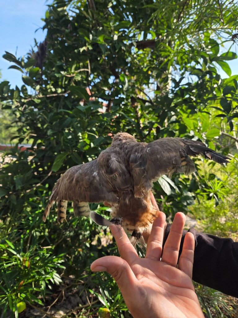 Un ejemplar de aguililla caminera (Rupornis magnirostris) con las plumas de las alas cortadas con el objetivo de que no pudiera volar y mantenerla “como si fuera un ave de corral” fue entregada para su atención y rehabilitación a la Unidad de Manejo Proyecto Santa María.