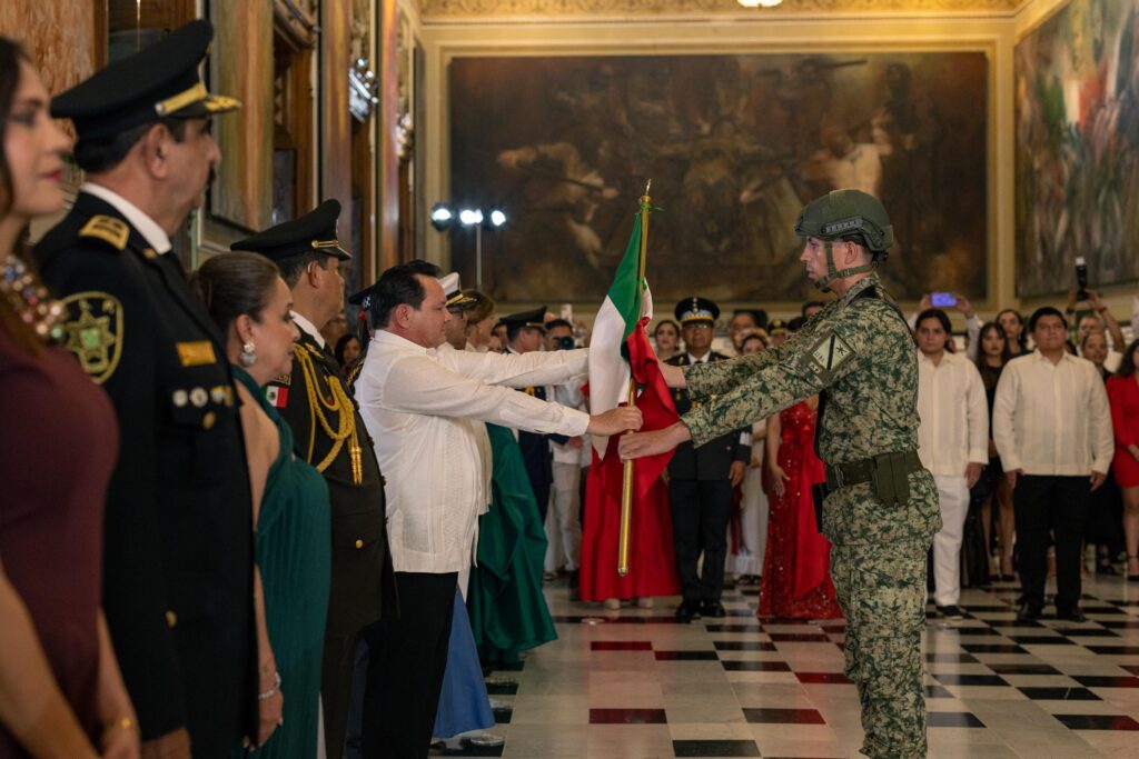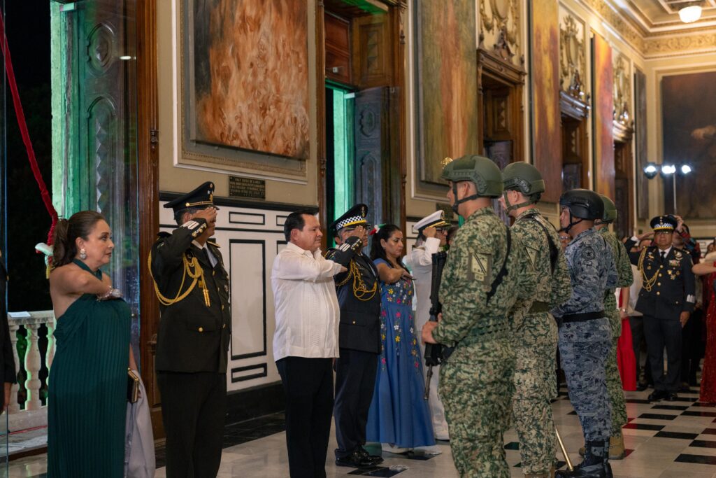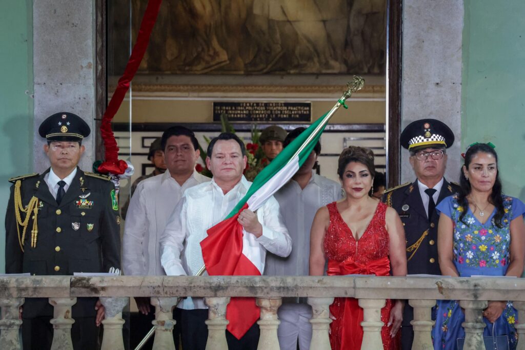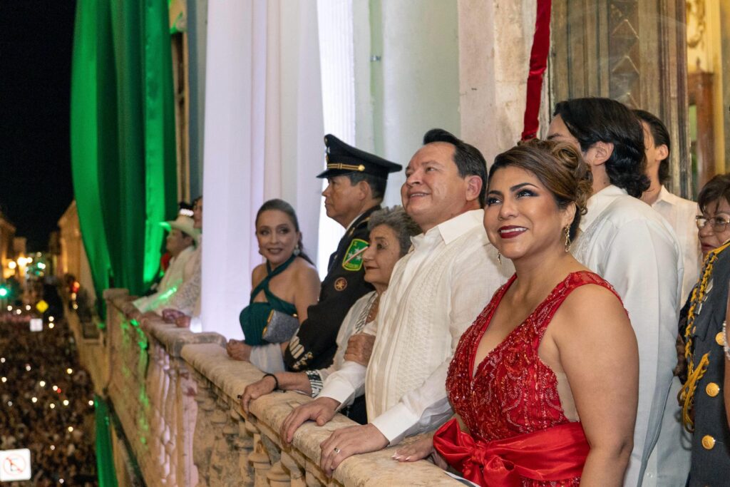 Acompañado de su esposa, la presidenta honoraria del DIF Yucatán, Mtra. Wendy Méndez Naal, de sus hijos Joaquín y Julián Díaz Méndez, así como de autoridades civiles y militares, el mandatario estatal salió al balcón central del Palacio de Gobierno para recordar a los héroes que dieron libertad a la nación y ondear la Bandera Nacional ante la multitud.