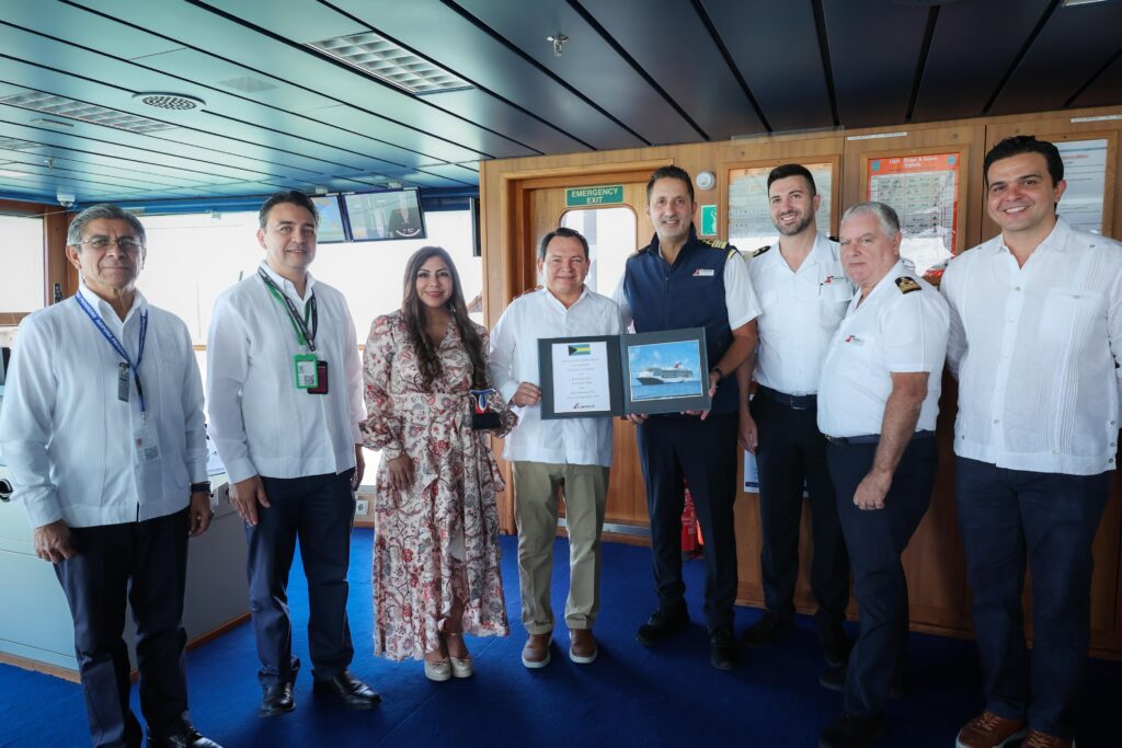 El Gobernador Joaquín Díaz Mena, en compañía de la Presidenta Honoraria del DIF Yucatán, Mtra. Wendy Méndez Naal, encabezó la ceremonia de bienvenida, durante la cual se efectuó el intercambio de placas conmemorativas con el capitán del buque, Massimiliano Roja, ante representantes de la naviera, autoridades estatales y municipales, para estrechar lazos de amistad y conmemorar este evento.